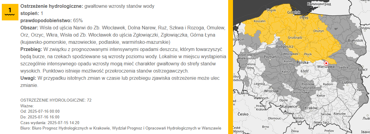 Gwałtowne wzrosty stanów wody - 16.07.2025 r.